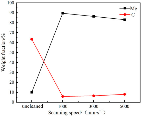 Figure 17 shows the EDS scanning results of the cleaned sample surface at different scanning speeds. The results indicate that as the scanning speed increases from 1000 to 5000 mm/s, the C content increases, while the Mg content decreases gradually. Under the scanning speed of 1000 mm/s, the content of C element decreased from 63.43% before cleaning to 5.77%, and the clearance rate reached 90.90%. The clearance rate was 89.88% at 3000 mm/s and 89.83% at 5000 mm/s. It can be seen that under the condition of an average power of 300 W, the scanning speed has little effect on the cleaning efficacy. As the scanning speed increases from 1000 to 5000 mm/s, the clearance rate decreases, but the slope is gentle and remains around 90%. Compared to the significant impact of average power and pulse frequency on the surface element content of the sample, the scanning speed is not considered to affect the cleaning efficacy of the lubricating coating significantly. Therefore, it is not the main focus of discussion.