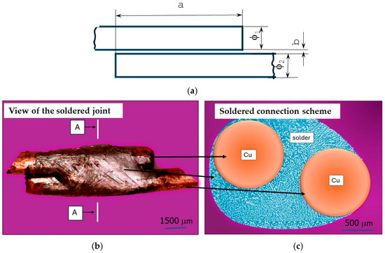 According to Figure 1a,b, the copper wires are stacked one above the other in parallel. The solder must penetrate the space between the wires (Figure 1c). The process and the selected material must ensure adequate wettability between the copper substrate and the solder structure produced. No voids should be observed at the border of the separation. A diagram of the predicted eutectic structure of the connection is shown in Figure 1c. The cross-section of the joint is elliptical in shape. The shorter radius of the ellipse is comparable for all tested samples, and the dimension of the radius of the longer ellipse depends on the assumed distance b between the soldered materials and ranges from 1.6 to 1.75 mm. The connection is made on a tab. The length of the joined edge a (Figure 1a) is 1 cm. This is the longest length that could be assumed for the planned application in the construction of the alternator.