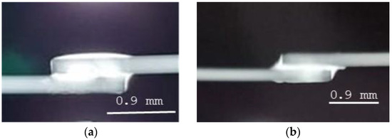As preliminary examinations, visual and X-ray examinations of the soldered joints were carried out, which were aimed at assessing the correctness of the connections. Macroscopic observation of the solder joints allows us to conclude that the joint is uniform, and the solder has been evenly distributed on the surface of the joined elements. Tests did not identify gaps, voids, or areas where the solder did not adhere to the base material. Macroscopic evaluation of the solder confirmed that in all samples, the solder is smooth, shiny, and homogeneous, which indicates that the joint was properly made. The results of the X-ray examinations confirmed that the base material was properly melted with the solder (Figure 2a,b).