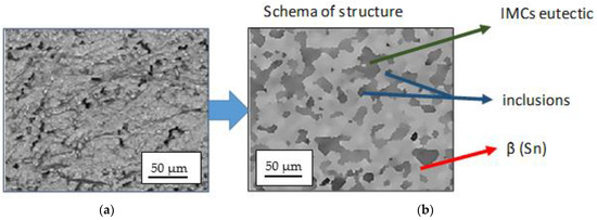 - Small particles of the forming Cu6Sn5 intermetallic phase, which, as the second reinforcing phase, retain their properties unchanged during operation, thus strengthening the soldering alloys, which is confirmed by the literature data [10,11,12,13].