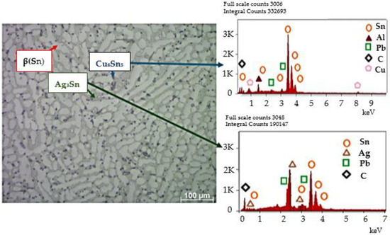 The formation of Cu6Sn5 and Ag3Sn phases and the increase in the β-Sn phase are, therefore, crucial for the quality of the joints obtained. According to the literature data [2,3], the evaluation of solder joints should include the control of intermetallic formations. The growth of Ag3Sn and Cu6Sn5 nanoparticles is interrelated. In the case of the nanoparticles of the intermetallic phase aggregate on the surface of IMCs, they hinder the diffusion of Sn and Cu ions and, thus, slow down the growth of the Cu6Sn5 layer. The microstructure of the solder, together with the analysis of the chemical composition of the precipitates, is presented in Figure 5.