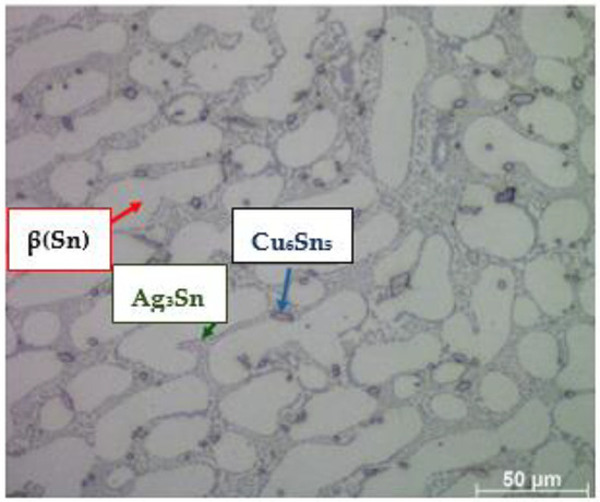 - Eutectics with intermetallic phases of the Ag3Sn type, in which eutectics create a diffusion barrier that prevents a rapid reaction between the applied solder and the Cu substrate, and the Ag3Sn particles limit the diffusion of Sn, determining the excessive growth of Cu6Sn5 (Figure 8).