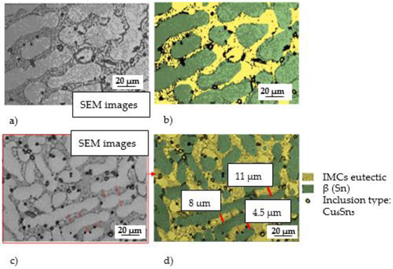 The researchers showed that the intermetal-reinforced lead-free composite they studied had better mechanical strength than the lead solder. Therefore, it can be assumed that the observed unexpanded, uniformly distributed intermetallic phases in eutectics will have a strengthening effect (Figure 7). The hypothesis will be verified with tensile strength tests. In addition, the facts quoted from the literature indicate that the introduction of a small amount of an additional ceramic element reduces diffusion processes by increasing the thermodynamic resistance of IMC growth.