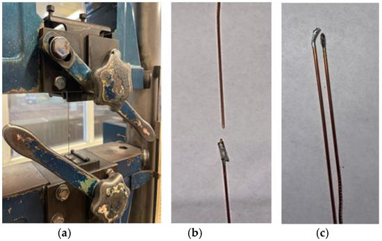 Tensile testing of solder joints. (a) Specimen fixation; (b) specimen break outside the joint; (c) specimen break in the joint.