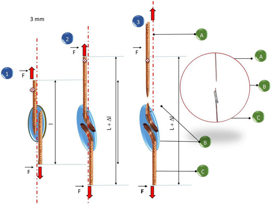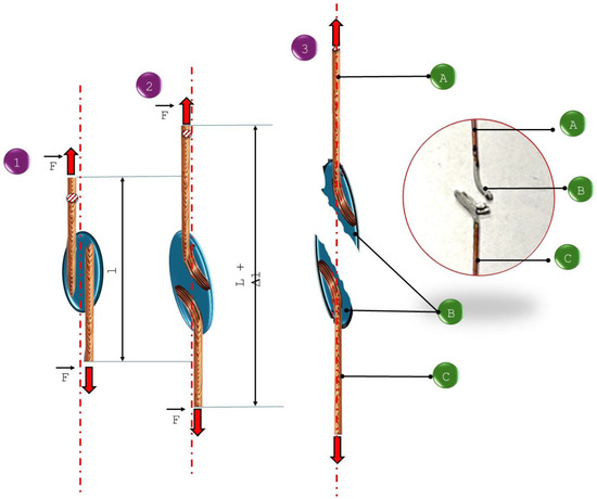 The tested specimens made using the newly developed solder for the solder gap in the range of 0.1–0.3 mm cracked during the tensile test outside the area of the solder joint as a result of shear forces and deformation of the base material during the test, which indicates high strength of the joint and its correct workmanship (Figure 9). For newly developed joints made with a solder gap of 0.3–0.5 mm, cracks were noted in the joint, and the recorded breaking force was much higher than the force needed to break a classic junction made using a tin–lead solder (Figure 10). Schematically, the mechanisms of cracking depending on the adopted solder gap are shown in Figure 10 and Figure 11. According to the diagrams, tensile forces act on the joint, causing the cross-section of the specimen to lengthen and narrow, as well as shear forces causing the characteristic deformation of the material at the ends of the welded wires. When a wider solder gap was used, the material cracked diagonally in the solder according to the action of shear forces. Cracks in the base material, outside the joint area, in its immediate vicinity, were noted for joints characterized by a narrow solder gap. These cracks were also associated with the simultaneous action of tensile and shear forces, which caused significant deformation of the base material. As a result of bending the base material (copper wire) at the point of contact with the lap joint, the structure of the base material was weakened, which was destroyed under the action of forces.