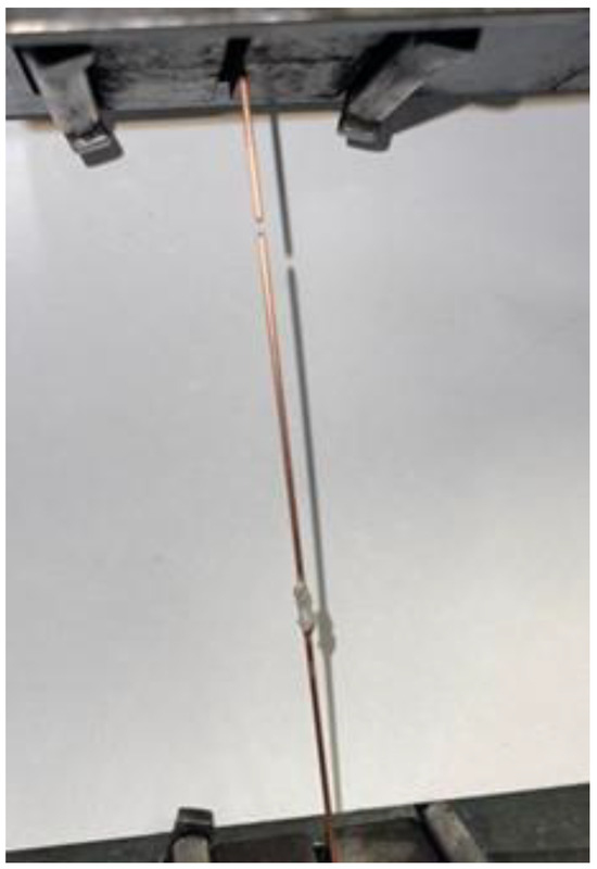 Then, it was decided to perform radiographic tests according to the EN 17636-1 standard. Solder joints of two copper wires with a diameter of 1.5 mm, connected over a section of 15 mm, were used for the research. Previously, the wires were mechanically cleaned and moistened with flux FLUX-TKP-101 (producer Cynel-Unipress Sp. z o.o. Białołęcka 231 B Street, 03-253 Warszawa, Poland). The copper wires were placed in a special holder that ensured their stable position over a distance of 10 cm during the examination. Positioning was crucial to obtain a uniform radiographic image and the appropriate detection quality of possible defects. The radiographic equipment was then calibrated, adjusting the exposure parameters to the requirements of EN 17636-1 [47]. The device settings were configured to produce high-quality images equivalent to the W18 quality class.