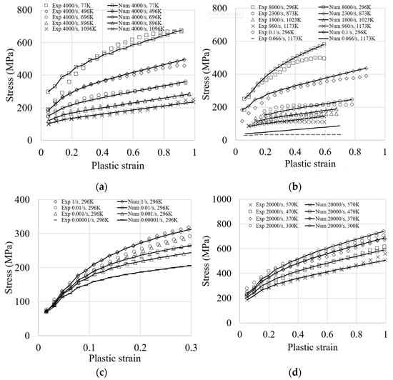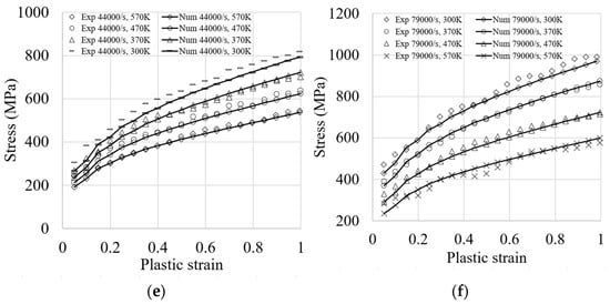 and are the number of simulated tests and the number of data points in each test, respectively. and are the experimental and predicted flow stresses, respectively. The databases used in the automated minimization process are available in [86,88,89,90]. The calibrated set of material parameters is given in Table 2. The results of the calibration are illustrated in Figure 1. A good fit is obtained between the experimental database and the simulation results, which accurately describe the strain-rate sensitivity at different strain rates and temperatures. For instance, it can be observed from the fitted curves that the material becomes more sensitive to strain-rate variation where, at a given plastic strain of 1, the peak stress increases from about 700 MPa (4000/s) to 1000 MPa (79,000/s). Furthermore, the model has better capabilities in describing the material hardening compared to other existing models, which are assessed using the same experimental database, such as the Johnson–Cook, Steinberg–Cochran–Guinan–Lund, Zerilli–Armstrong, Mechanical Threshold Stress, and Preston–Tonks–Wallace plasticity models [85]. There are, however, some limits of the model in mimicking the hardening regime of copper at very high strain rates (8000/s) and low temperatures (296 K), which are due to the dependence of the yield stress to the initial dislocation density, and hence, to the initial and unknown microstructure configuration of the tested samples. In addition, softening due to the damage mechanism is not accounted for in the model. The strong coupling of the constitutive equations to a damage model would lead to better agreements.