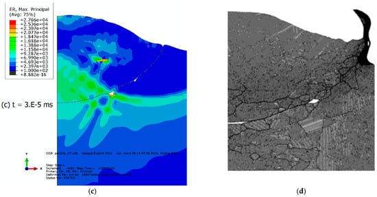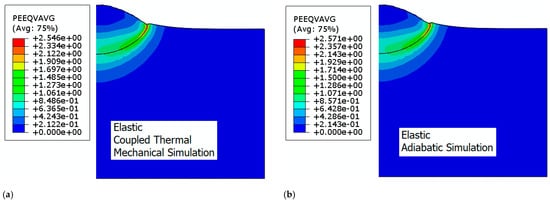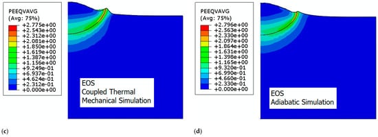 The simulations presented above illustrate the various shapes of the deformed particle. The simulations give a reasonable deformed shape of the particle in comparison with the experimentally observed deformed particle shapes [25]. Specifically, Figure 3a,b showcases the particle’s deformation when the elastic regime of the material is isotropic, and no EOS is accounted for. Figure 3c,d illustrate the results when EOS is considered. As demonstrated in Figure 3a,b, the particle remains confined within the substrate, and the inclination of the substrate material at the rim is minor. A negligible quantity of material arises from the interface of contact. The substrate deforms, creating a mechanical hooking along the rim. Conversely, in Figure 3c,d), the particle undergoes significant deformation at the contact surface with the substrate, causing material from both parts to displace towards the border. Notably, the substrate material at the border forms a circular bead with an inclination that can vary considerably. Specifically, for thermal mechanical simulation coupled with EOS (Figure 3c), which is the scenario that is most likely to occur, there is no peripheral hooking as observed for the other cases, which suggests the occurrence of another mechanism for adhesion. The particle cross-section presents a wavy shape which is not distinguishable when isotropic elasticity is considered to highlight the effect of the hydrostatic stress on deformation. This inclination serves as an indicator of the deformation intensity, and it is exacerbated by the elevated temperature experienced during impact.