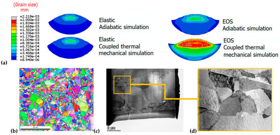 Figure 4a shows the grain size distribution in the deformed particle obtained by numerical simulations. In contrast to the other scenarios where the entire particle undergoes severe plastic deformation, grain refinement in the case of coupled thermal–mechanical simulation and EOS mostly occurs at the particle’s calotte, resulting in a surrounding area with a small grain size. Therefore, the role of hydrostatic stress seemingly promotes shearing and grain refinement in the periphery of the particle rather than achieving a diffuse refinement and an even distribution of plastic deformation throughout its entire body. The grain refinement at the particle substrate interface agrees well with the experimental observations [92,93]. Indeed, in a bigger scale, an overview observation in Figure 4b reveals grains with a random orientation, exhibiting a mix of ultra-fine and coarse sizes. This analysis shows that the CSAM Cu features a bimodal equiaxed grain structure, consisting of ultra-fine nano-grains ranging from 200 to 500 nm and micro-grains approximately 1 μm in size; the findings are available in [92]. This is in agreement with the grain sizes predicted numerically and ranging between 100 and 300 nm. These observations are strengthened by TEM observations and TKD analysis in Figure 4c,d, where micro-grains with no dislocation defects can be found surrounded by the typical equiaxial feature with grain sizes of 100–200 nm. Consequently, there is an impact on the dislocation density distribution. Numerical simulations shows that the total dislocation density is highest in the interparticle region, as shown Figure 5a, and only minimal microstructural changes occur at the particle core. The experimental results, such as the KAM map in [94], exhibit high KAM values in the particle interfaces in the copper coating, reflecting a higher dislocation density. As a result, adiabatic simulations provide higher temperatures, leading to a diffuse plasticity and an even distribution of the grain size over the particle, while the thermomechanical simulation caused a lower temperature due to heat transfer (EOS and thermomechanical simulation), thus promoting dislocation multiplication and strain hardening at the particle periphery.