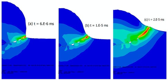 Plastic strain and waves observed during impact and their evolution with time for the coupled thermal mechanical case with EOS. (a) Early stages of the impact at t = 6 × 10−6 ms; (b) t = 1 × 10−5 ms; and (c) t = 2 × 10−5 ms.