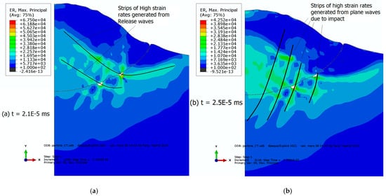 The shear localization criterion, represented by the shear localization factor SL, can then be monitored to depict the regions where shear localization occurs. By considering damage initiation and evolution in the new simulations, the areas of shear localization can be clearly identified. In Figure 12, we display three important quantities: the damage initiation criterion, shear localization areas, and shear localization factor SL. Firstly, the extent of shear instability has been previously described at the particle–substrate interface. Clearly, shear localization occurs at the shear instability region (interface), where the substrate displays severe surface discontinuity (Figure 12b). This occurrence of shear localization is crucial for particle–substrate bonding and necessary for mechanical interlocking between both surfaces. As mentioned earlier, the most common feature of shear localization is the formation of rollups in the shear instability region at the particle–substrate interface, especially for hard/soft material combinations. There is a second shear localization region inside the particle itself that does not affect the interface properties. Nevertheless, the SL in this region is caused by high stress levels and may constitute a source of shear band formation and crack initiation inside the particle, leading to substructure formation and particle fragmentation or splitting. Another research framework will be dedicated to the latter in a separate paper.
