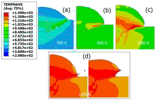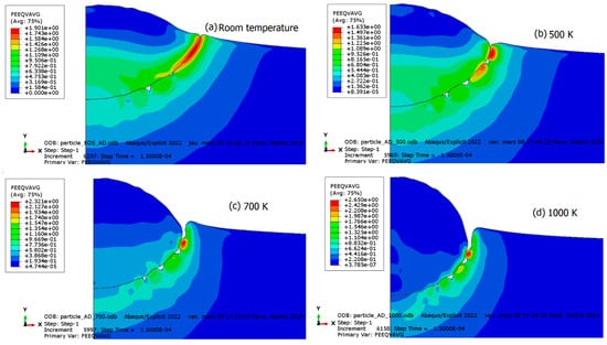 When the temperature approaches the melting point of the material, it exhibits fluid-like behavior, causing the plastic wave front to advance to the contact surface border and sporadically expel particle material to that region. Therefore, its effect is expected to be similar to the mechanical material softening due to excessive plastic deformation and damage development. In this section, we will focus on the effect of shear viscosity on the appearance of instabilities and material deformation. As mentioned earlier, the present study will use the simultaneous preheating of the both particle and substrate through different initial values of temperature, leading some of those cases to reach the viscosity threshold, above which the material behaves as a fluid-like Newtonian. In the present section, the temperatures chosen to exacerbate this effect are 500 K, 800 K, 1000 K, and 1200 K for the parts considered. The shear viscosity drastically but quasi-linearly decreases with increasing temperature. Consequently, the cohesion stress decreases, leading to a material more favorable to fluid flow. In all cases, even though shear viscosity is high at room temperature, the corresponding stress is still substantially lower than that generated by material hardening, unless the material experiences significant heating dissipation generated by plastic deformation.