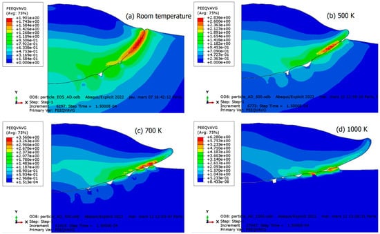 The decrease in shear viscosity results in thermal material softening. Figure 8 illustrates the deformation of the particle and substrate assembly. It is evident that the deformation significantly increases when the viscosity threshold is reached earlier by imposing higher initial temperature to the parts considered. Material jetting occurs in the latter scenario at an early stage of impact due to the temperature rising beyond the viscosity threshold. Instabilities at the particle–substrate interface are apparent due to the difference in flow rates. The viscosity effect manifests as a drop in stress, thereby filling gaps in the particle–substrate interface with particle material, promoting intimate contact between the two, as depicted in Figure 8c. The latter scenario is likely to occur in case of extreme preheating of the particle and the substrate, as can be seen in some high temperature processes such thermal and plasma spraying. However, the scenario underscores the importance of viscosity in particle deformability, as it influences stress reduction and thermal softening. To further demonstrate the viscosity effect, additional simulations are conducted with preheated particle or substrate temperatures of 500 K, 700 K, and 1000 K (see Figure 9). In the case of a preheated particle, higher temperatures closer to the viscous threshold result in the severe flattening of the particle, as can be seen in Figure 10. This phenomenon is commonly observed in cold spray when soft particles deform on a hard substrate, either by using a different combination of materials [97] or softening one of the two materials by a preheating. Shear instabilities are also observed at the particle–substrate interface for all scenarios. However, an increase in particle temperature leads to a transition from uniform plastic deformation to localized regions with peaks of plastic deformation near the contact surface border. Furthermore, preheating the substrate leads to deeper particle penetration associated with an extended instability region at the interface as can be seen in Figure 9. Again, this is similar to a hard particle–soft substrate impact, such as in a copper–aluminum material system [98].