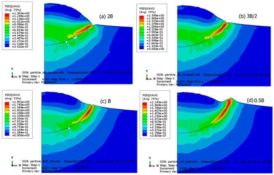 In the dislocation drag regime, which characterizes strain-rate hardening, viscous drag forces act on mobile dislocations. The drag coefficient, which relates stress to strain rate, plays a particularly significant role in this regime. Therefore, under conditions of very high strain rates, changes in this coefficient are expected to have a drastic impact on particle deformation and interfacial behavior. To assess its effect, several finite element simulations of particle impact have been conducted using different values of the drag coefficient, denoted as B. Specifically, values of 0.5B, B, 1.5B, and 2B were chosen. The results of plastic deformation are depicted in Figure 11. An analysis of the figure reveals that an increase in the drag coefficient leads to greater interfacial stability and reduced particle flattening. This observation can be attributed to the tight relationship between the drag coefficient and yield stress, which ultimately governs material hardness. Consequently, an increase in yield stress minimizes plastic deformation, particularly at the particle–substrate interface. This finding underscores the critical role of the drag coefficient in dictating the mechanical response of the system under high strain-rate conditions.