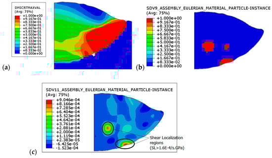 (a) The damage initiation criterion; (b) activated shear localization zones in the particle; and (c) the corresponding shear localization factor SL.