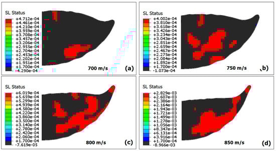 The effect of impact velocity on the SL region extent in the particle. (a) 700 m/s; (b) 750 m/s; (c) 800 m/s; and (d) 850 m/s.