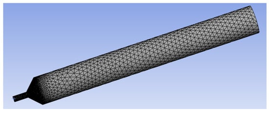 It can be known from the above analysis that the flow field velocity of the melt is mainly related to the structural parameters of the internal flow channel of the nozzle. Therefore, only the three-dimensional model of the internal flow channel of the nozzle was meshed. In this paper, the meshing tool in the ANSYS Workbench (version 2021) platform is used. The mesh type was set as regular tetrahedrons. In order to make the convergence speed faster and improve the simulation calculation accuracy at the melt outlet, the mesh at the outlet was refined, as shown in Figure 2.