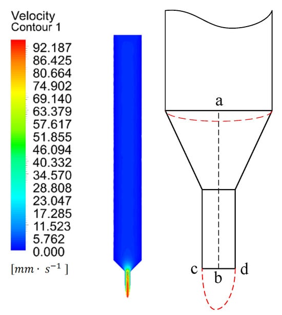 Figure 3 shows the simulated melt velocity field under the conditions of the printing temperature (400 °C) and the wire feeding speed (2 mm/s). It can be seen that the melt flows in the melting chamber at an average speed of 5 mm/s, and the flow velocity of the melt presents a quasi-uniform distribution within the chamber. After the fluid enters the converging section, the flow velocity gradually increases and reaches its maximum when flowing out at the end of the converging section. When the fluid reaches the outlet, it gushes out in a convex shape, and the flow velocity near the pipe wall is less than the jet velocity near the pipe center. In order to display the respective laws of the melt velocity at the converging section and the outlet more clearly, a simulation model of the nozzle was constructed, as shown in Figure 4 and Figure 5. The segment ab represents the axial direction of the nozzle outlet, and the segment cd represents the radial direction of the nozzle outlet. Then, the velocity fields of these two different segments were further simulated.