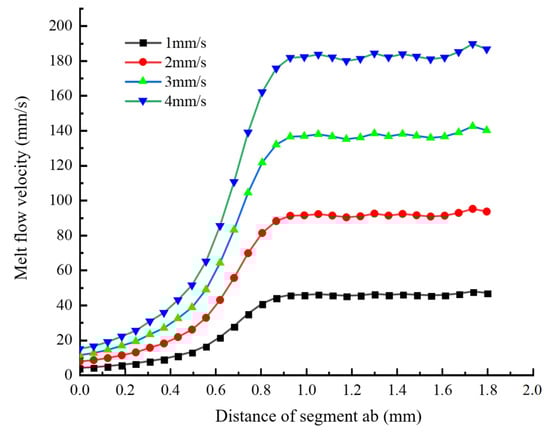 Figure 4 shows the changing trend of the melt flow velocity along segment ab under different wire feeding speeds (1 mm/s, 2 mm/s, 3 mm/s, and 4 mm/s). It can be seen that the changing trends of the melt flow velocity in the axial direction of the nozzle outlet under different wire feeding speeds are similar. They all rise first, then reach the maximum velocity range, change within this range, and, finally, tend to be stable. In other words, the melt velocity increases rapidly within the converging section of the nozzle and reaches the maximum level after moving a certain distance along the outlet. As the wire feeding speed increases (by 1 mm/s), the velocity at the inlet of the converging section increases steadily at a rate of 3.6 mm/s and reaches the maximum value (14.52 mm/s) when the wire feeding speed is 4 mm/s. Under different wire feeding speeds, the maximum extrusion velocities of the melt are 46.66 mm/s, 93.31 mm/s, 139.97 mm/s, and 186.62 mm/s, respectively. When the wire feeding speed increases by 1 mm/s, the maximum extrusion velocity of the melt increases steadily at a rate of 46.65 mm/s. This indicates that the extrusion velocity of the melt increases linearly with the linear increase of the wire feeding speed, also conforming to the pipe flow formula . It can be known that, when the flow rate is fixed and the inlet velocity and cross-sectional area are certain, the smaller the outlet cross-sectional area, the faster the outflow velocity.
