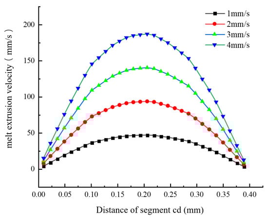 Figure 5 shows the changing trend of the melt flow velocity along segment cd under different wire feeding speeds (1 mm/s, 2 mm/s, 3 mm/s, and 4 mm/s). It can be seen from Figure 5 that, under different wire feeding speeds, the changing trends of the melt extrusion velocity in the radial direction of the nozzle outlet are similar, showing a Gaussian distribution. Due to the existence of the viscous effect of the liquid and the wall friction, a velocity boundary layer appears near the wall. When the wire feeding speed is 1 mm/s, the extrusion velocity near the center of the outlet cross-section is relatively large, and, as the radial distance (that is, the distance from the outlet center line) increases, the extrusion velocity gradually decreases. However, as the wire feeding speed increases, the gradient of the radial velocity change of the melt gradually becomes larger, mainly because the increase in velocity leads to an increase in pressure drop. Generally speaking, the jet velocity in the center of the nozzle outlet is the largest, and the jet velocity near the pipe wall is the smallest. In addition, as the wire feeding speed increases, the gradient of the change in the melt extrusion velocity at the center of the nozzle outlet gradually increases.