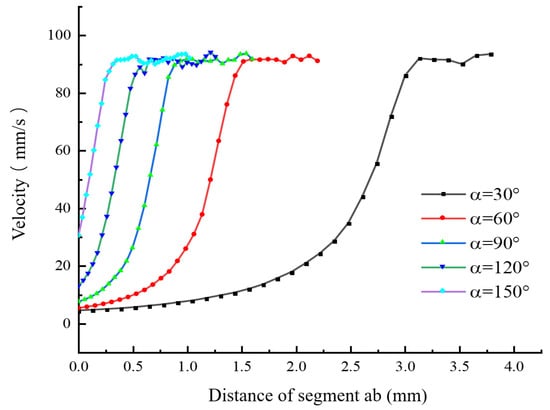 Velocity distribution of the melt along segment ab under different convergence angles.