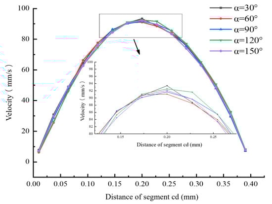 Velocity distribution of the melt along segment cd under different convergence angles.