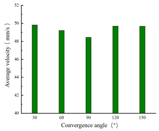 While keeping the other parameters of the nozzle unchanged, numerical simulations were conducted on the nozzle fluidity under different convergence angles ( = 30°, 60°, 90°, 120°, and 150°), and the influence of the convergence angle on the melt flow velocity was obtained. Figure 6 present the simulation results of the flow velocity under different convergence angles.