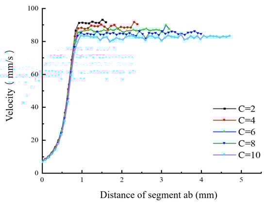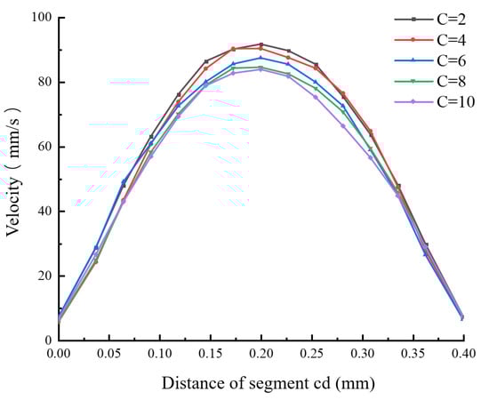 Figure 9 and Figure 10 show the velocity distributions of the melt along segment ab and segment cd under different length-to-diameter ratios. It can be clearly seen that, as the length-to-diameter ratio increases, the flow velocity of the melt gradually decreases, indicating that, when the length of the discharging section is relatively long, the melt velocity increases more slowly. This is because, when the length of the discharging section is relatively long, the pressure difference within the discharging section is reduced and the resistance of the fluid that needs to be overcome increases, thus reducing the melt flow velocity. In the axial direction, as C increases, the melt flow velocity near the nozzle outlet first increases and then tends to stabilize within a very small velocity range. When nozzles with different length-to-diameter ratios are used, the variation laws of the velocity of the melt along segment cd are similar, and the melt flow velocity is at its fastest near the center of the nozzle. As the radial distance increases, the flow velocity gradually decreases. Figure 11 is a histogram of the distribution of the average extrusion velocity under different length-to-diameter ratios. It can be seen from the figure that, as the length-to-diameter ratio C increases, the average velocity at which the melt is extruded from the nozzle gradually decreases and reaches its maximum when C = 2. Moreover, the change in the value of C has little impact on the flow velocity in the radial direction (segment cd), indicating that the nozzle achieves the optimal extrusion velocity when the length-to-diameter ratio C is 2.