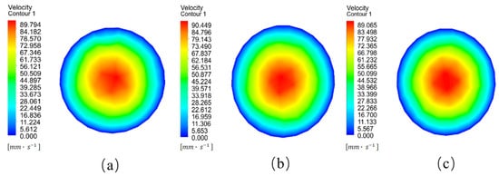The nozzles, before and after optimization, were imported into the ANSYS Fluent software (version 2021) for fluid simulations. The pre-processing conditions for the fluid analysis were kept unchanged. The velocity contour diagrams of the melt at the nozzle outlet cross-section before and after optimization are shown in Figure 12. The CFD Post tool in the Workbench platform was used to calculate the average value of the velocity at the nozzle outlet cross-section. The results are shown in Table 3.