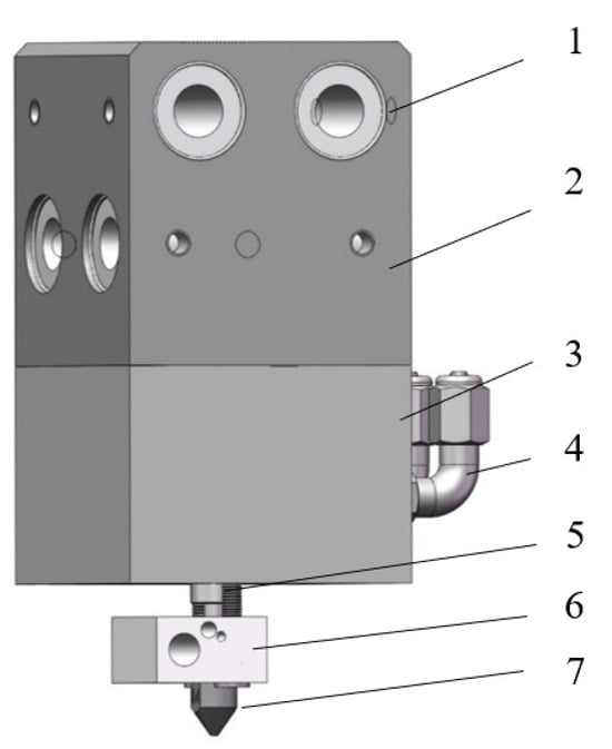 - Han, S.; Xiao, Y.; Qi, T.; Li, Z.; Zeng, Q. Design and analysis of fused deposition modeling 3D printer nozzle for color mixing. Adv. Mater. Sci. Eng. 2017, 12, 2095137. [Google Scholar] [CrossRef]