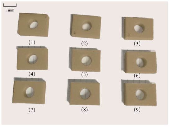 - Orthogonal experiments were adopted to analyze the influence of the printing speed, layer thickness, nozzle temperature, and infill rate on the dimensional accuracy of the printed workpiece in the , , and directions as well as of the diameter of the circular hole. The conclusion was drawn that the order of the influence intensity of each factor on the dimensional accuracy of the test samples in the x and y directions was the same (printing speed > nozzle temperature > layer thickness > infill rate), and the preferable test conditions were also the same (a printing speed of 15 mm/s, a layer thickness of 0.2 mm, a nozzle temperature of 420 °C, and an infill rate of 50%). The layer thickness had the most significant influence on the dimensional accuracy in the direction, and the infill rate had a relatively small influence on the forming accuracy.