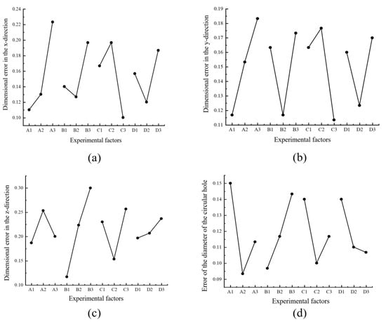 Curves of the relationship between each factor level and the evaluation indexes: (a) relationship between each factor and the dimension index in the x-direction; (b) relationship between each factor and the dimension index in the y-direction; (c) relationship between each factor and the dimension index in the z-direction; (d) relationship between each factor and the circular hole diameter index.