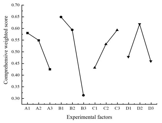 Based on the comprehensive weighted scores in Table 11, the average values and the ranges of each level for the four factors were calculated. The results are shown in Table 12. Similarly, the relationship diagram between the comprehensive weighted scores and the levels of each factor was also drawn, as shown in Figure 20.