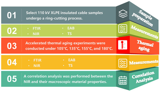 A flowchart illustrating the methodology of this study is presented in Figure 1. The process begins with the preparation of samples, specifically utilizing 110 kV XLPE cables to create ring-cut specimens. Following sample preparation, a series of tests—namely FTIR, EAB, TS, and NIR—are conducted to obtain initial results, which are meticulously recorded. Subsequently, the prepared samples undergo accelerated thermal aging tests at specified temperatures of 105 °C, 135 °C, 155 °C, and 180 °C. The accelerated thermal aging tests were conducted, following the guidelines outlined in IEC 60811-401 [15], ensuring consistency and reproducibility of results. This step is crucial for simulating long-term aging effects and leads to the acquisition of aged samples. After the aging process, a second round of FTIR, EAB, TS, and NIR testing is performed on these aged samples, with results again being systematically documented. Finally, a comprehensive correlation analysis is carried out to explore the relationships between the NIR data and the results obtained from the other testing methods. This analysis aims to establish numerical correlations that may enhance our understanding of the mechanical properties of the aged XLPE cables and their potential implications for future applications in power systems.