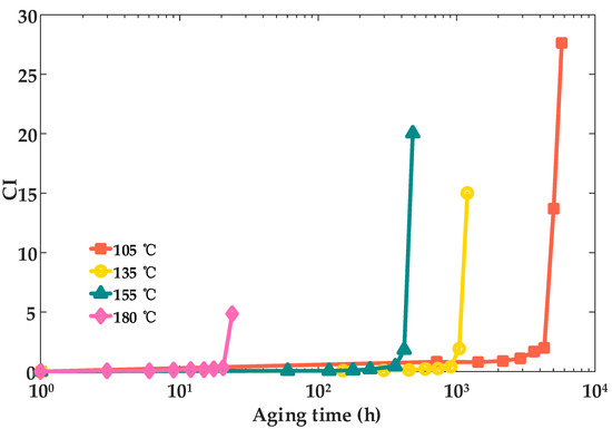 In order to study the variation pattern of the carbonyl index (CI) in XLPE cable insulation, the FTIR test was carried out. CI is determined based on the ratio of the intensity of the carbonyl characteristic absorption peak to that of the reference group in the infrared spectrum of the sample. This process is automatically calculated by the software during the instrument testing. Figure 3 illustrates the relationship between the carbonyl index and aging time for cable insulation samples subjected to thermal aging at temperatures of 105 °C, 135 °C, 155 °C, and 180 °C. The curves provide a comprehensive depiction of how the carbonyl index evolves over time under varying thermal conditions, reflecting the progression of oxidative aging in the material.