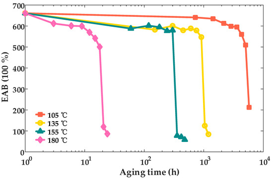 In order to study the variation pattern of the EAB with aging time, the EAB test was carried out. Figure 4 presents the EAB test results for XLPE cable insulation samples subjected to thermal aging at temperatures of 105 °C, 135 °C, 155 °C, and 180 °C. These results provide valuable insights into the mechanical performance of the material under varying thermal aging conditions, highlighting the impact of elevated temperatures on the material’s elasticity and durability.