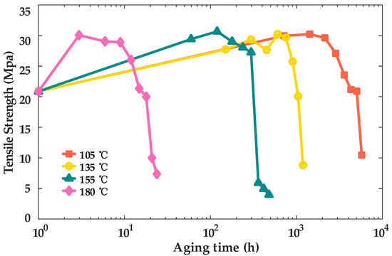 In order to study the variation pattern of the TS with aging time, the TS test was carried out. Figure 5 presents the tensile strength test results for XLPE cable insulation samples subjected to thermal aging at temperatures of 105 °C, 135 °C, 155 °C, and 180 °C. These results provide critical insights into the mechanical strength and structural integrity of the material under prolonged exposure to elevated temperatures, illustrating the effects of thermal aging on its tensile performance.