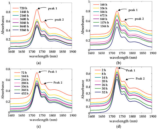 Variation curves of the near-infrared spectroscopy of XLPE insulation at the same aging temperature: (a) 105 °C; (b) 135 °C; (c) 155 °C; (d) 180 °C.
