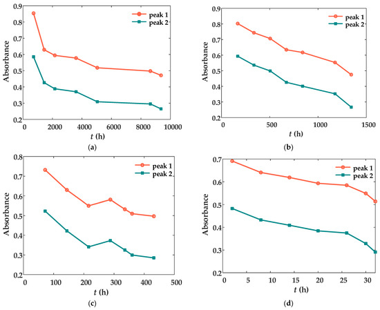As illustrated in Figure 7, at all four test temperatures, the peak values of the two selected characteristic absorption peaks generally exhibit a decreasing trend with increasing aging time. However, a slight deviation from monotonicity is observed in Figure 7c, which can be attributed to factors such as short aging-time intervals and minor variations in the material’s internal consistency. Furthermore, the functional equations describing the relationship between aging time and the peak values for each group of curves can be derived from Figure 7, as presented in Equations (1)–(4). These equations were obtained using curve-fitting techniques [25,26,27], where an exponential fitting model was applied. The least squares method was utilized to minimize the sum of squared errors between the experimental data and the predicted values, ensuring a robust representation of the observed trends.