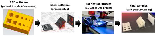 The fabrication process was performed on a commercially available 3DGence ONE printer (3DGence Sp. z.o.o., Przyszowice, Poland) with the following specifications: model: ONE; print technology: FFF (fused filament fabrication); number of printheads: 1; dedicated slicer software 3DGence Slicer using the process parameters given in Table 2. Test samples fabricated by the FFF method using ABS filament (3DGence Sp. z.o.o., Przyszowice, Poland)—whose specifications are given in Table 3, according to the process chain demonstrated in Figure 1—consisted of circular and square cross-sections through features of varying dimensions ranging from 1 to 5 mm (Figure 2). In samples of heights (G) 1 mm, 2 mm, and 3 mm, holes were designed and printed under 3 orientation angles: 0°, 45° and 90°. In the first step, samples containing small circular and square holes were designed by Autodesk Inventor Professional 2024 CAD software (San Francisco, CA, USA). After that, the designed models were saved as STL files to create surface geometries. 3DGence Slicer software (v4.0, 3DGence Sp. z.o.o., Przyszowice, Poland) was used to set all relevant slicing and process parameters, as given in Table 2. The set of process parameters was recommended by the slicing software according to the characteristics of the type of filament and the device used. In the final step, the models were cut into the specified layer thickness, while the generated program (G-code) was uploaded to the 3D printer. Support structures were generated automatically in the slicer software, considering the print orientation. After completing the building process, the samples were separated from the 3D-printer platform, and the support structures were removed (basic post-processing).