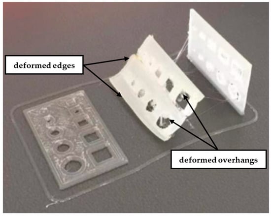 After finishing the printing process, the quality of test samples containing features of different shapes was assessed. Initial macroscopic observations indicated that most of them were successfully completed with the parameters used. Only in the case of samples printed at an angle of 45° were significant deformations observed, which made it impossible to obtain the full contours of the designed holes; see Figure 4. Despite repeating the process of printing them several times, a similar result was obtained each time, which was mainly due to the relatively low height G of the sample made of ABS material susceptible to deformation.