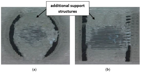 Furthermore, for samples printed at a 90° orientation, it was necessary to use additional support structures for both the analyzed cross-sections; see Figure 5. Further analysis and measurements included only those holes that did not require the application of additional processing, in order to demonstrate the real possibilities of producing internal features with a specific clearance, without the use of post-processing.