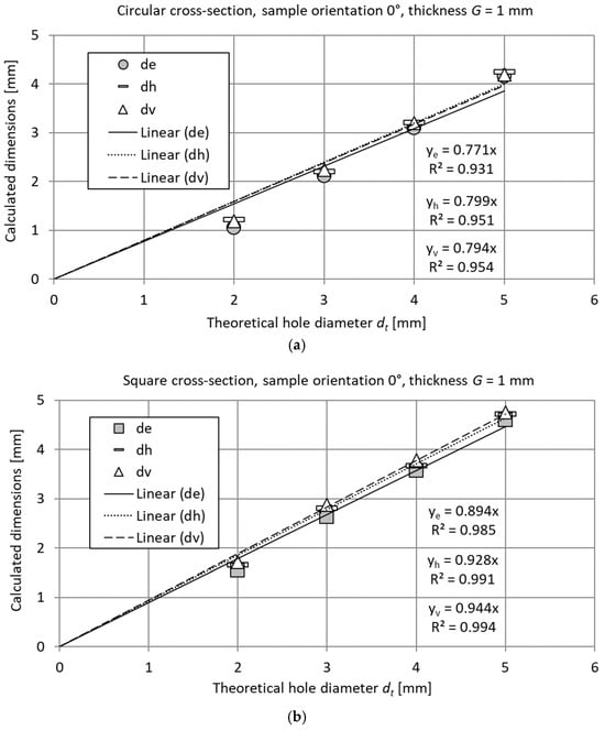 As seen in Table 6 and Table 7, the proposed function for calculating all the diameters enabled good fitting of the experimental data for samples of different thicknesses. The linear functions determined for square holes were characterized by the better fitting with the lower Δymax, δmax, and RMSE errors, with the exception of diameter de for a sample height of 3 mm and printing orientation 45°.