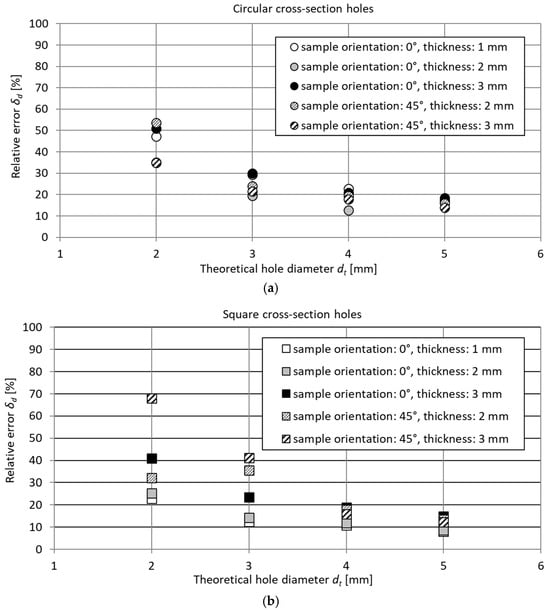 The differences between dimensions dt and de were at a similar level for all dimensions and shapes, resulting in the value of relative errors decreasing with increasing dimensions; see Figure 9. A similar trend was observed for each of the analyzed printing orientations and feature lengths.