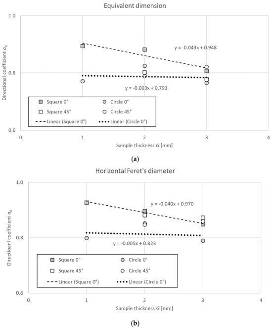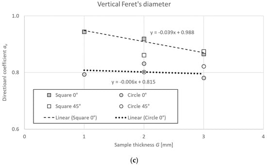 The relationship between hole length (sample thickness G) and directional coefficient a of a linear function determined for theoretical hole diameter dt in the range of 2–5 mm: (a) equivalent dimension, (b) horizontal Feret’s diameter, and (c) vertical Feret’s diameter.