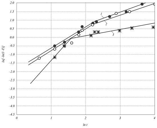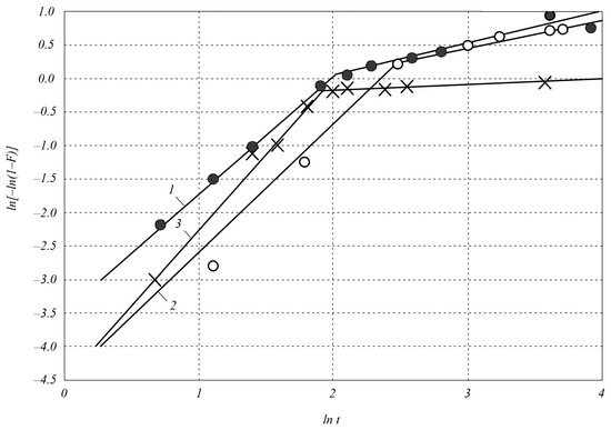 The graphs are plotted in the coordinates ln[−ln(1 − F)] and lnt. These are straight, broken lines characterized by different angles of inclination and, accordingly, different values of n and k. On this basis, the compaction process can be divided into stages that differ in mass transfer mechanisms [24].