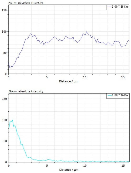 Studies have shown that during electrospark sintering at a pressure of 45 MPa, solid-state sintering in composites with an admixture of titanium carbide is better than in composites with an admixture of vanadium carbide due to increased interaction at the phase boundaries. The interaction zone increases from ~1.0 μm at the boundaries of silicon carbide grains and vanadium carbide grains (Figure 7). It increases to ~1.5 μm at the boundaries of silicon carbide grains and titanium carbide grains (Figure 8). It is suggested that this is due to a certain non-stoichiometric nature of TiC, which may enhance the interaction during sintering.