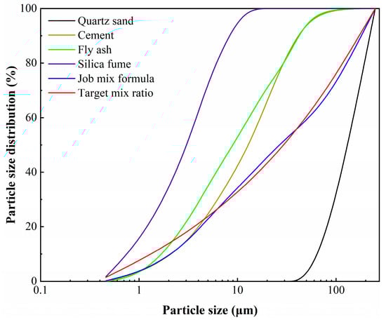 For this test, the chosen mixture ratio was volume ratio of cement: fly ash: silica fume: quartz sand, which was 0.43:0.18:0.03:0.36, the performance indices of these four materials, respectively, as shown in Table 3, Table 4, Table 5 and Table 6. A water reducing agent content of 0.1% of the mass of cementitious materials. Water–binder ratios of 0.19, 0.22, and 0.25, and fiber contents of 1%, 1.5%, and 2% were selected as variables to design nine groups of tests, and test fits were shown in Table 7.