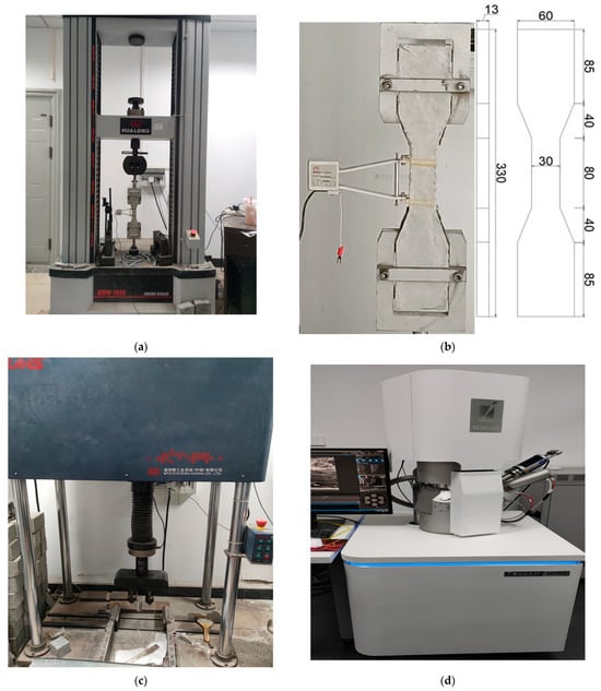 The tensile test was conducted according to JG/T2461-2018 [29]. The test was conducted using dog bone samples for tensile testing with a loading rate of 0.5 mm/min. During the tensile test, the tensile deformation of the tensioned section was recorded via an extensometer, and the stress–strain diagrams were plotted. The test apparatus and the dimensions of the dog bone are shown in Figure 2a and Figure 2b.