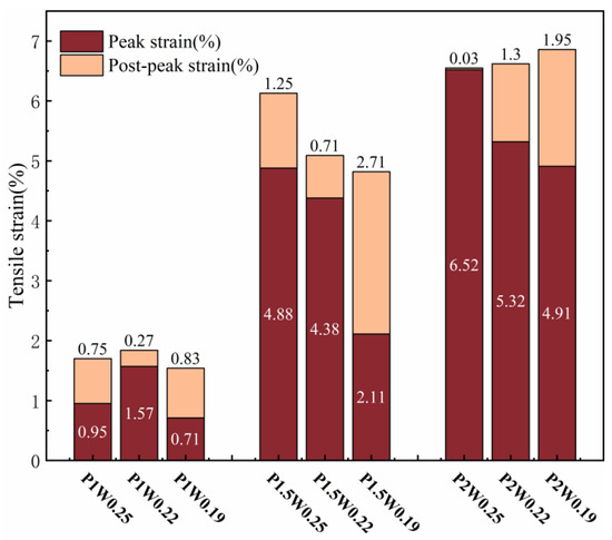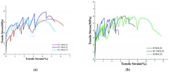 Figure 4 shows the stress–strain curves of the ECC samples after 28 d of curing, and the tensile samples exhibited strain-hardening characteristics, which were evaluated in terms of the magnitude of sample elongation. As shown in Figure 4a,b, when the fiber content was 1.5%, the elongations of the test groups with water–binder ratios of 0.19, 0.22, and 0.25 were 4.82%, 5.09%, and 6.13%, respectively, and the growth rate of the ultimate elongation was 27.18%, which indicated that the elongation increased with the increasing water–binder ratio. When the water–binder ratio was 0.25, the ultimate elongations of the test samples with 1.0%, 1.5%, and 2.0% fiber contents were 2.29%, 3.98%, and 6.55%, respectively, with an elongation growth rate of 186.03%. These results indicate that the fiber content has a great effect on the growth of the elongation of the ECC, whereas the water–binder ratio has a limited effect on the growth of the ECC elongation. With the increasing hydrogel ratio, the internal matrix/fiber bonding resistance of the sample decreases, the fibers are pulled and slipped, the internal bridging performance of fibers in the matrix increases, and thus, the elongation of the sample increases. With increasing fiber content, the internal structure of the sample with a high water–binder ratio is relatively loose, and the high modulus of elasticity of the fibers at the cross-section emphasizes the characteristics of the fibers, The greater the fiber content is, the stronger the ability of the sample to resist tensile deformation, so the P2W0.25 test group shows excellent strain hardening characteristics.